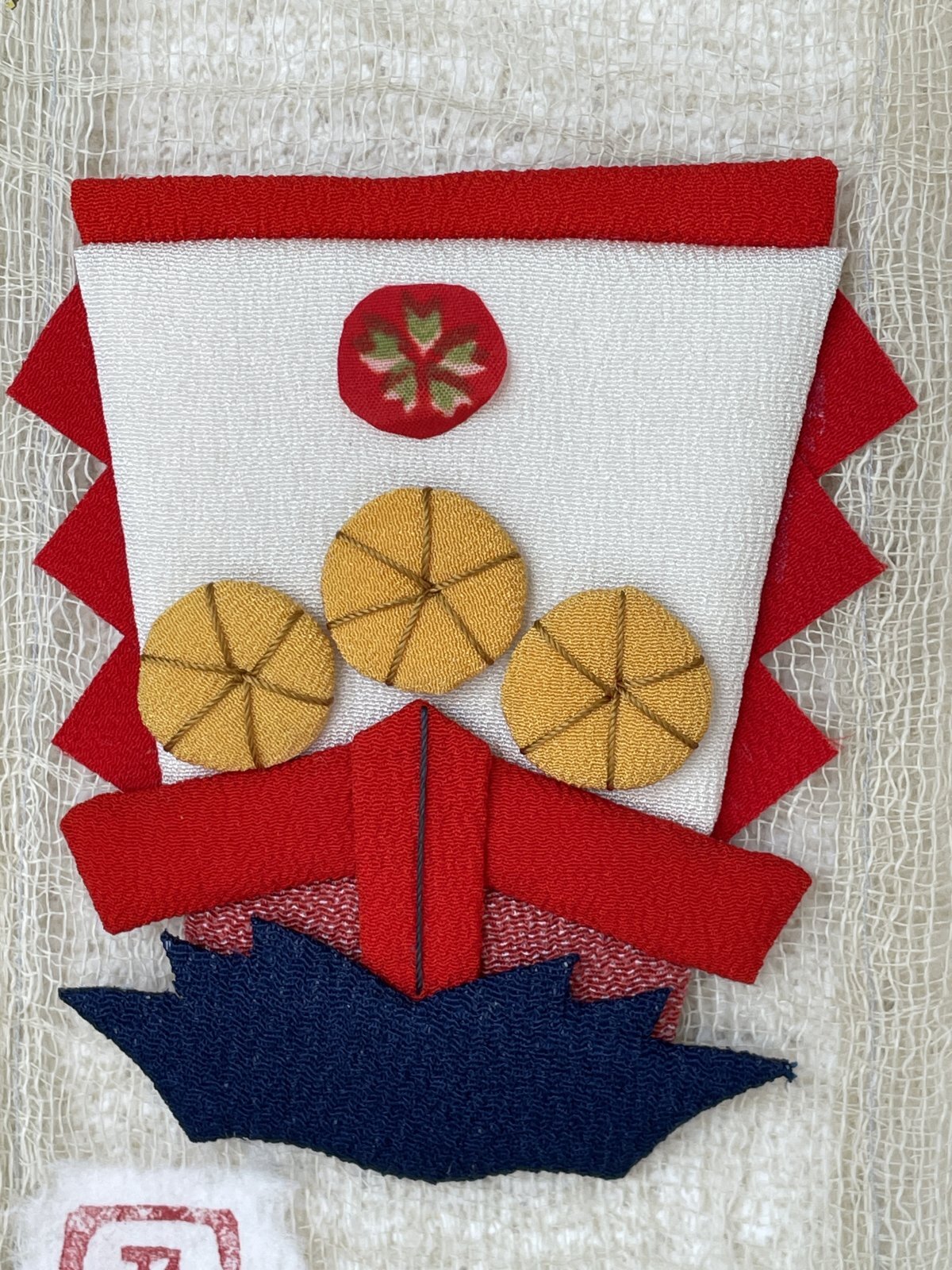 古い蚊帳を土台に縁起の良い宝船を押し絵で作りました。